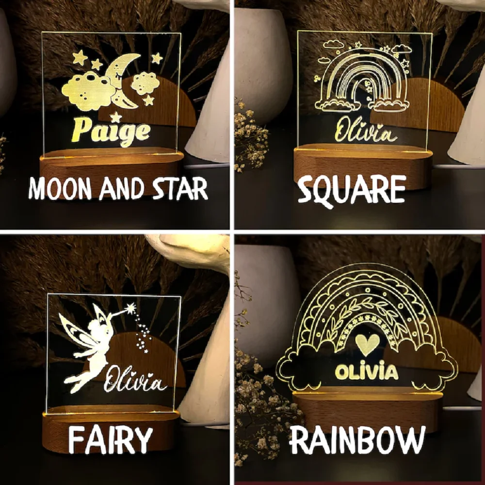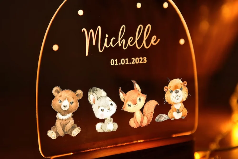 Personalized Name Night Light Animal Acrylic LED Light Gift Wooden base Baby Gift Children Child Bedroom Nursery Light